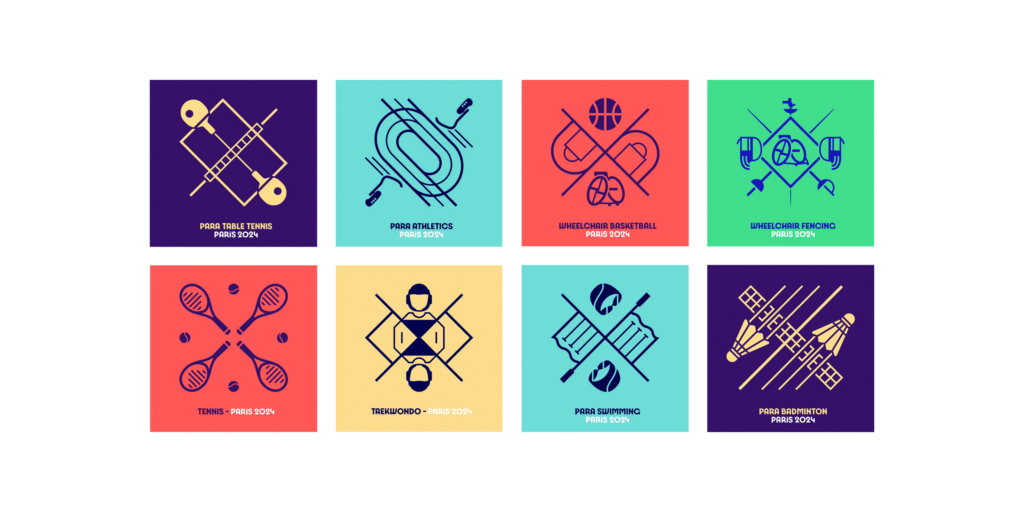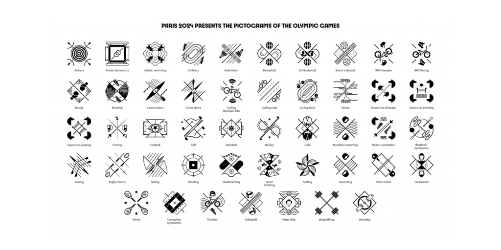 symbolism and historical references in the visual identity of Paris 2024, are very present in the graphic system of the competition. thus, the pictograms of the next Olympic Games are transformed into coats of arms, with a more graphic representation typical of heraldry. the pictograms presented break with the functional paradigm that has characterized these pieces from 60 years ago, when Musaru and Yamashita created the system of Tokyo 1964 pictograms.
