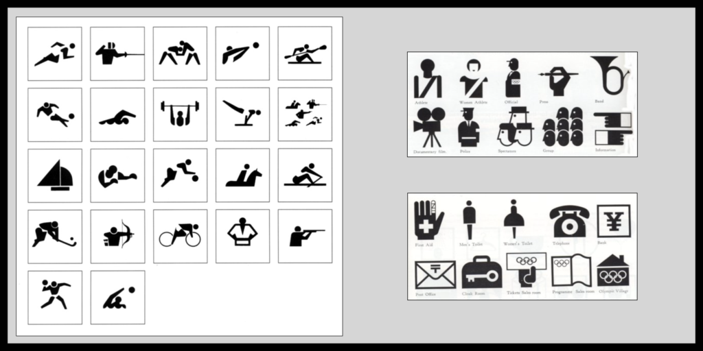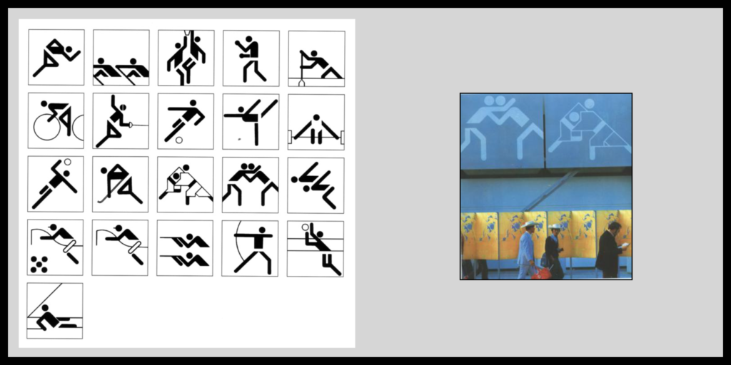 pictograms have been key in the visual identity of the Olympic Games, as part essential for space and media signage. during the preparation of the Tokyo 1964 Games, the use of pictograms was raised for the first time, in a context signage, to help in the orientation of athletes, journalists and the public attending out of the country.