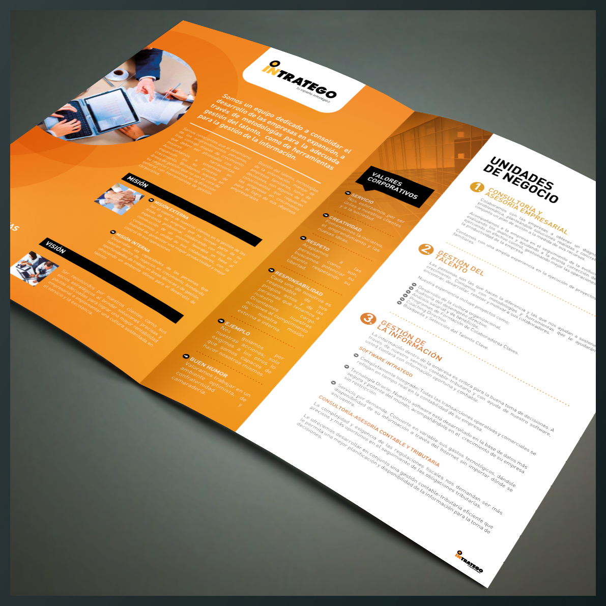 the values and main characteristics of the Intratego brand are represented in its visual identity corporate: responsibility, creativity and originality. these graphic formats will drive its communication and improve the concept of the brand in the market.