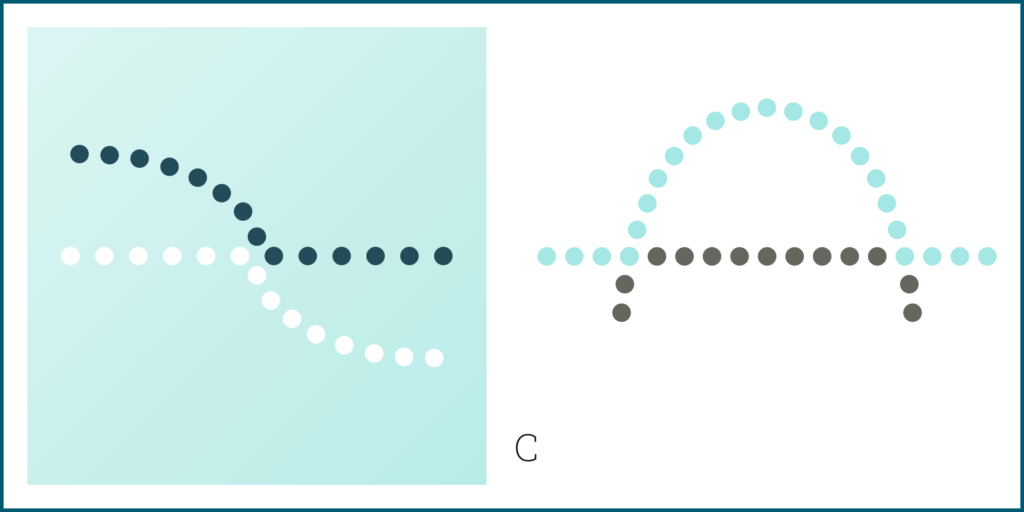 (C). the eye tends to want to follow the straight line from one end of this figure to the other, and the line curve from top to bottom, even when the lines change color halfway through.