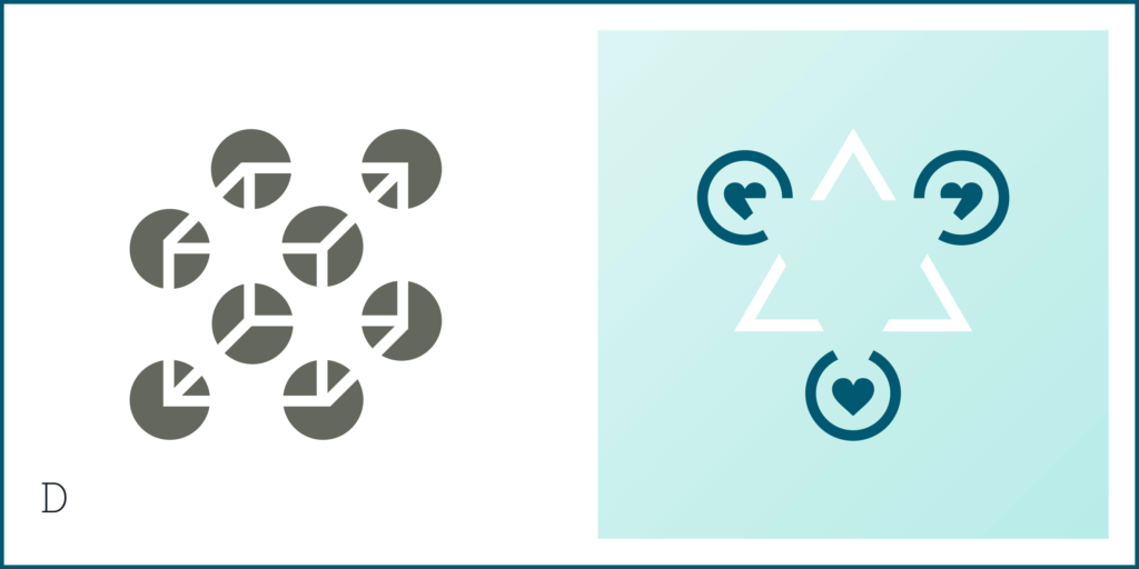 (D). the Gestalt closure principle is illustrated in these examples where the brain completes the forms white, although they are not well defined.